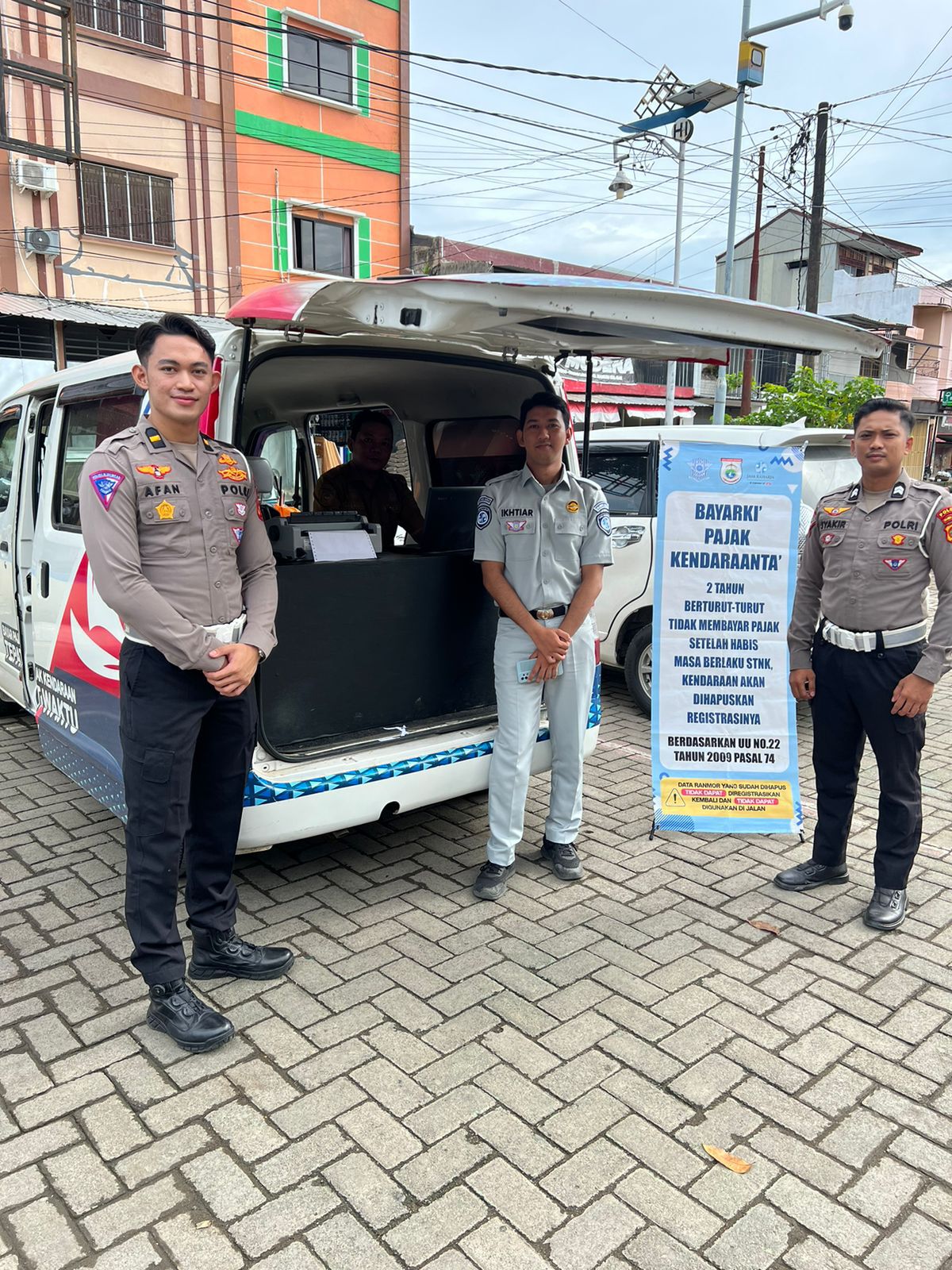 Terlihat di salah satu pusat keramaian di Mamuju Ipda Afanharapansyah bersama personel Ditlantas dan staf Samsat standby menunggu masyarakat yang hendak membayarkan pajak kendaraannya.