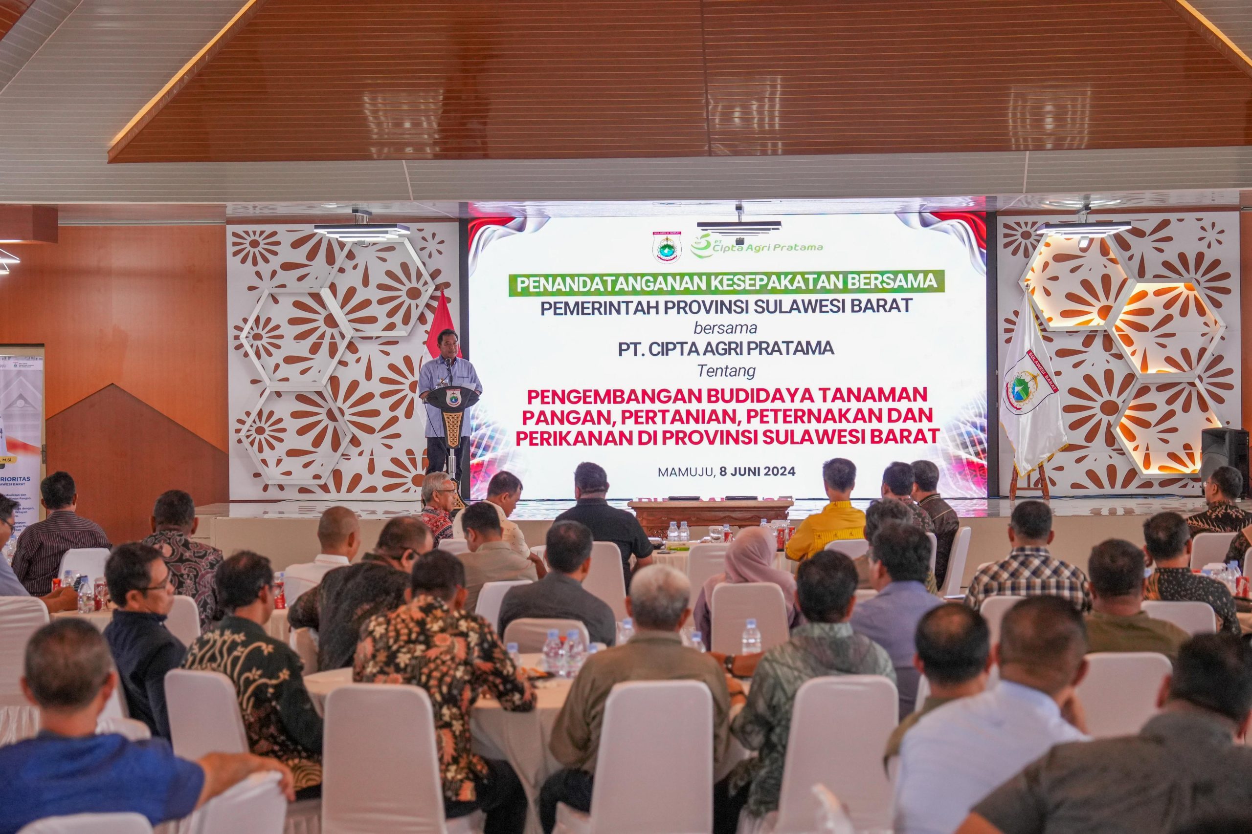 Bertempat di di gedung graha sandeq Pemprov Sulbar, Sabtu, 8 Juni 2024. Pemerintah Provinsi (Pemprov) Sulbar dan PT Cipta Agri Pratama (CAP) melakukan penandatanganan kesepakatan bersama pengembangan budidaya tanaman pangan, pertanian, peternakan dan perikanan.