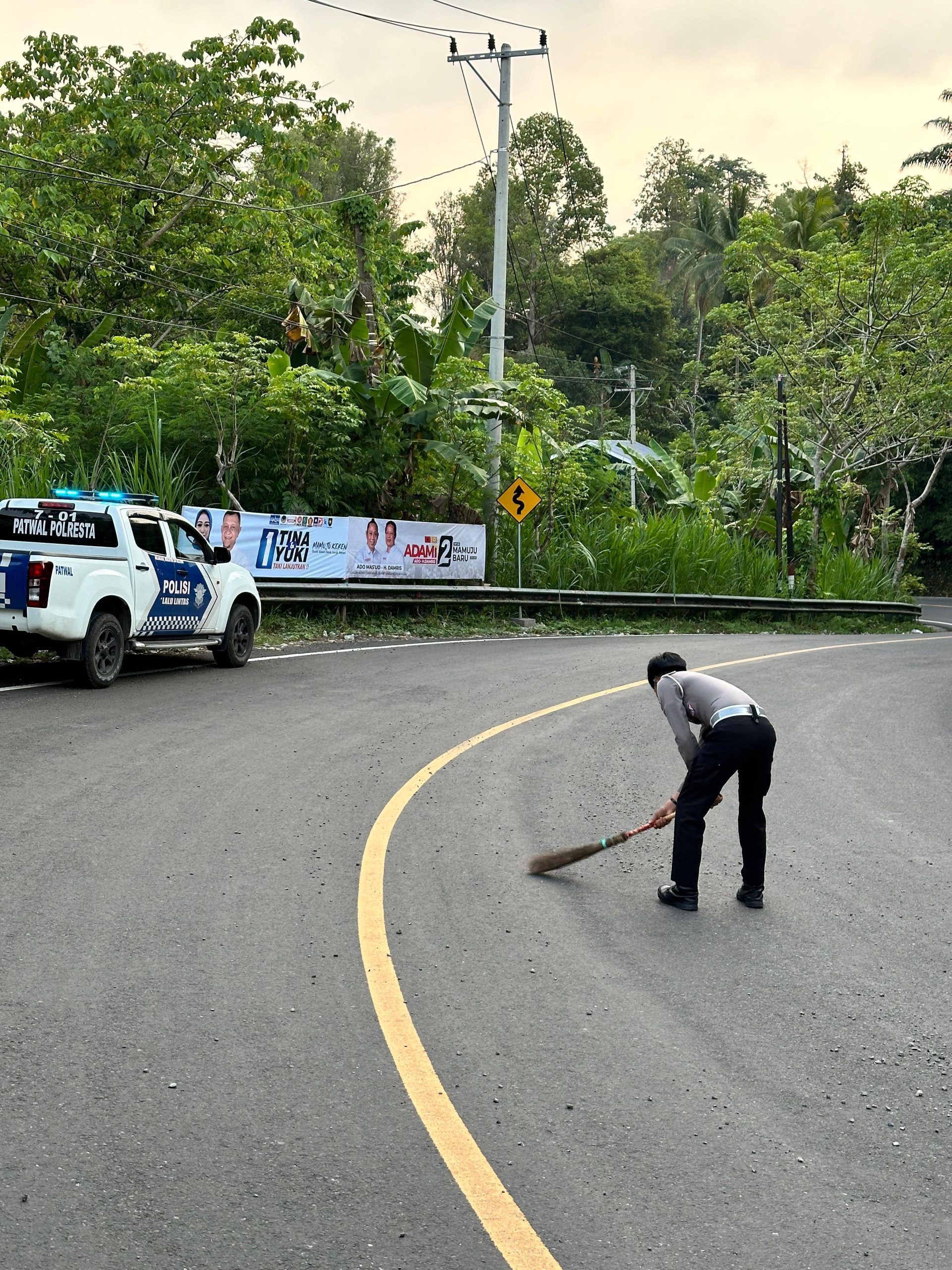 Pada pelaksanaan tersebut, nampak terlihat personil Sat Lantas Polresta Mamuju dengan mengenakan pakaian dinas kepolisian lengkap menyapu tumpahan kerikil dan pasir yang berserakan di Jalan Trans Sulawesi Poros Mamuju-Majene guna mencegah terjadinya kecelakaan lalulintas pada lokasi tersebut, sekaligus mewujudkan lingkungan yang bersih