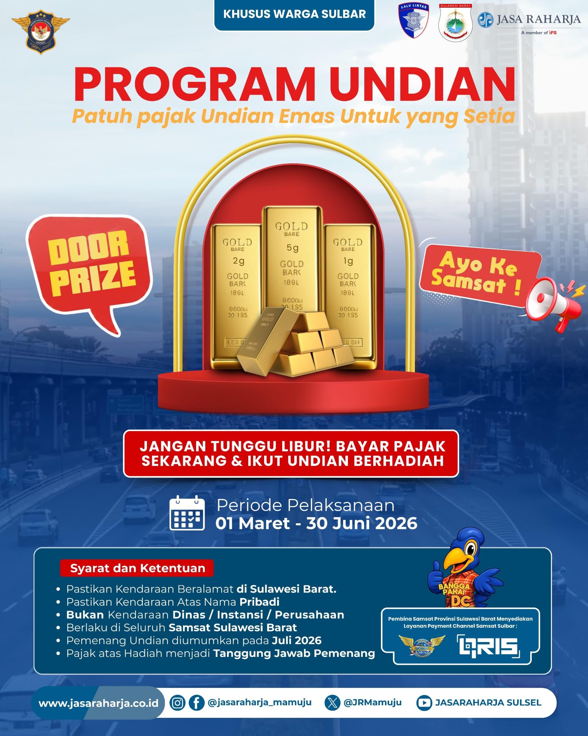 Kegiatan ini merupakan bagian dari sosialisasi program undian emas yang ditujukan bagi masyarakat yang melakukan pembayaran pajak tahunan kendaraan bermotor pada periode 1 Maret hingga 30 Juni 2026. Program ini diharapkan dapat menjadi stimulus tambahan bagi masyarakat untuk lebih disiplin dalam memenuhi kewajiban administrasi kendaraan.