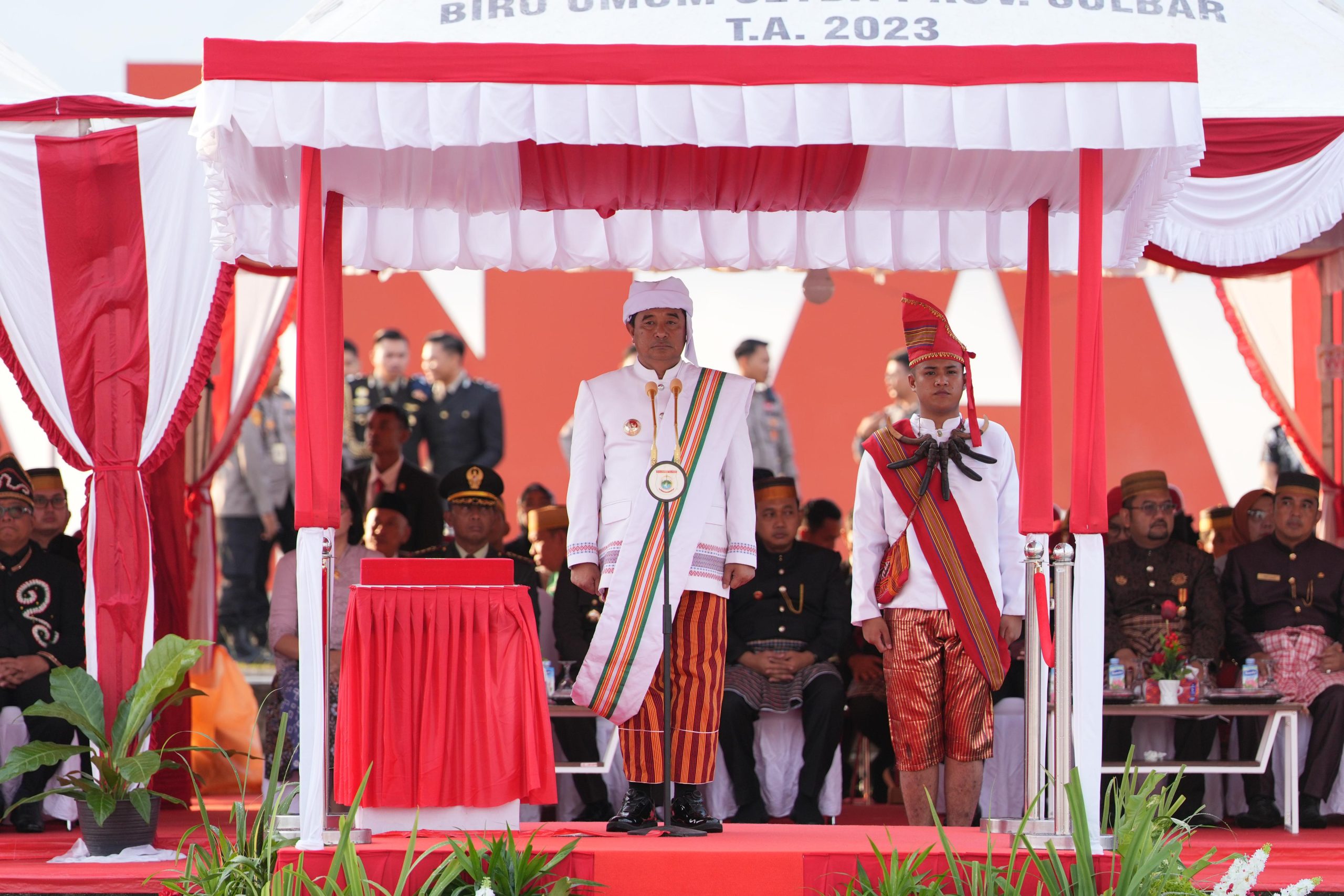 Pada upacara penurunan bendera merah putih tersebut peserta upacara masih menggunakan pakaian adat. Seperti Pj Gubernur Sulbar Bahtiar Baharuddin dan Nyonya Sofha Marwah yang menggunakan pakaian adat Mamasa. Begitu pula Sekda Sulbar mengenakan pakaian adat Kalumpang. Warna warni pakaian adat tersebut mencerminkan kebersamaan dan kekompakan dalam satu kesatuan balutan NKRI tingkat Prov Sulbar.