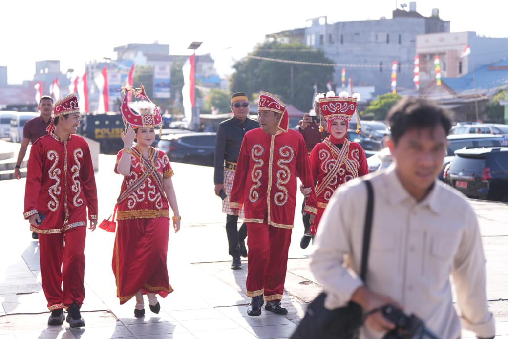 Pada upacara tahun ini, Pj Gubernur Sulbar Bahtiar Baharuddin bersama Pj Ketua TP PKK Sulbar , Ny Sofha Marwah Bahtiar mengenakan pakaian adat Kalumpang berwarna merah.
