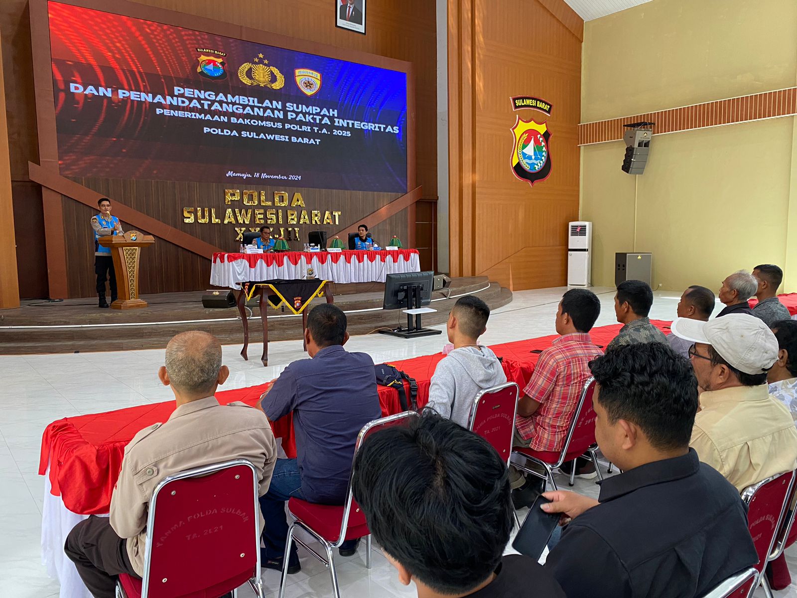 Mamuju, RelasiPublik.id – Sebagai komitmen awal untuk mengikuti proses seleksi Bakomsus Polri yang bersih, Transfaransi, Akuntabel dan Humanis (Betah), 96 calon peserta Bakomsus Polri Tahun Anggaran 2025 Polda Sulbar mengikuti pengambilan sumpah dan penandatanganan Pakta Integritas, Senin (17/11/24) di Aula Marannu Mapolda.