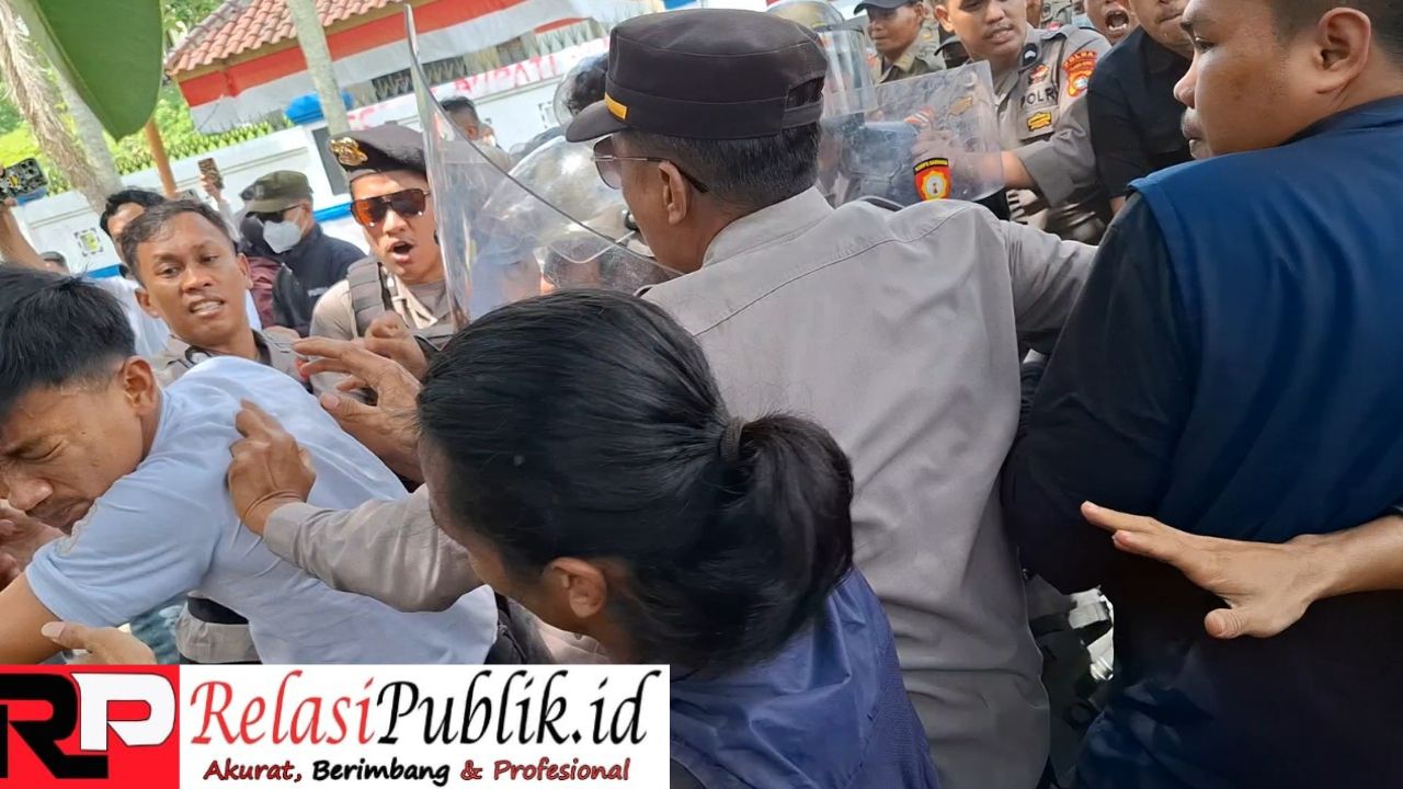Sejumlah petugas terlihat berupaya menenangkan massa agar situasi tetap kondusif, sementara koordinator lapangan berulang kali meminta peserta aksi untuk menahan diri.