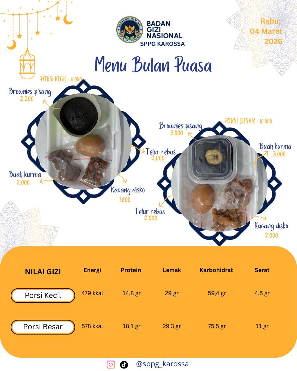 Menu yang disiapkan terdiri dari brownies pisang, telur, kacang disko, dan buah kurma.